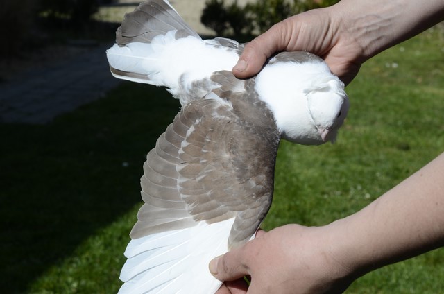 | Bonjour, J'ai un jeune pigeon sorti du nid depuis peu dont la couleur m'interpelle... Issu d'un couple formé d'un mâle cravaté oriental ancien à liseré noir, et d'une femelle cravaté allemand ancien bleu écaillé (T-pattern je pense), il est d'un brun clair dont je ne connais pas le nom et surtout je ne comprend pas comment cette couleur a pu ressortir....? Papa :