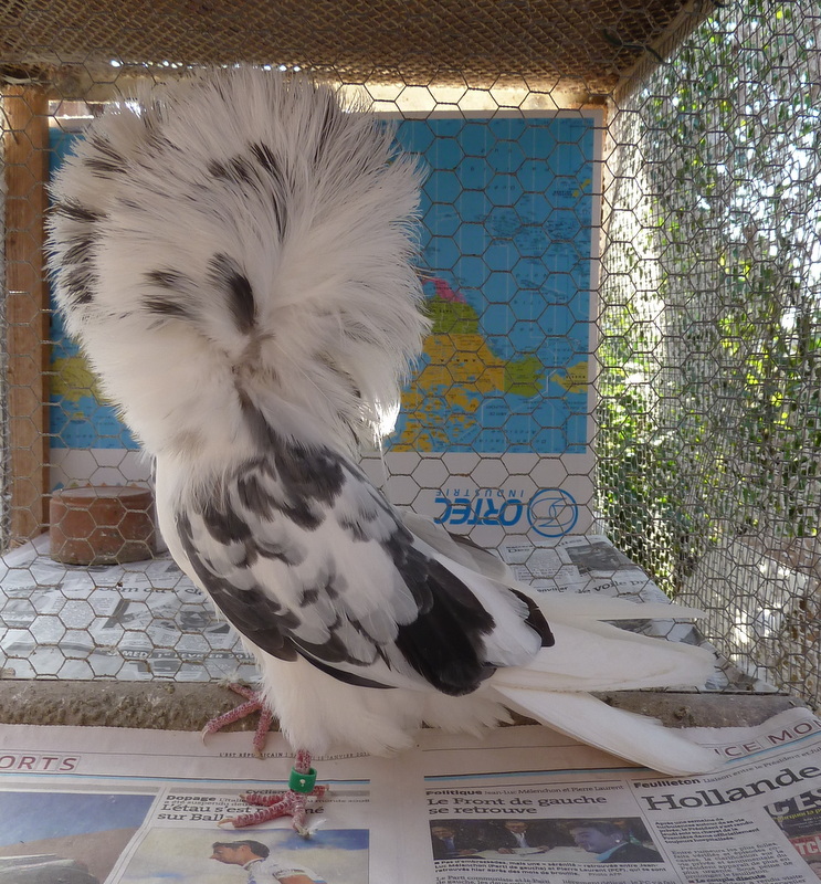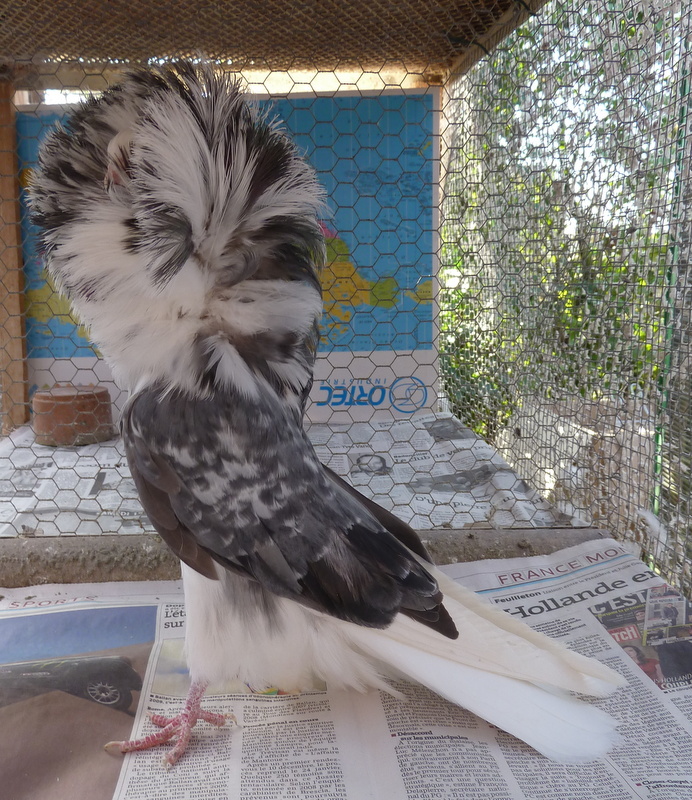 | Suite à quelques interrogations survenues notamment lors du championnat d'Europe du capucin sur le gène grison et papilloté, je vais illustrer par quelques photos les pigeons qui peuplent mes volières : Voici grand maman, que je classerai en papilloté bleu barré, je ne l'ai connu qu'adulte et déjà assez blanche.