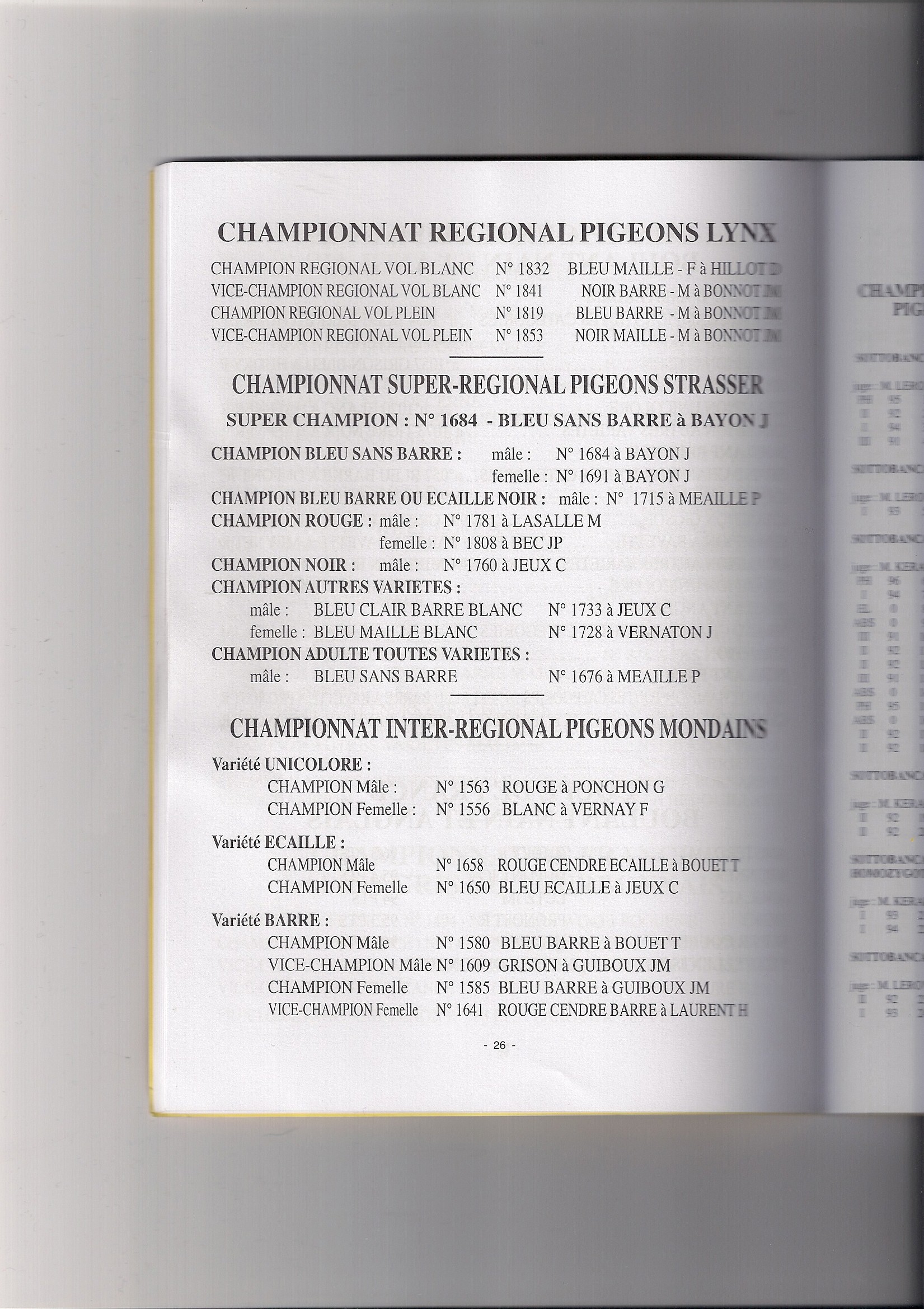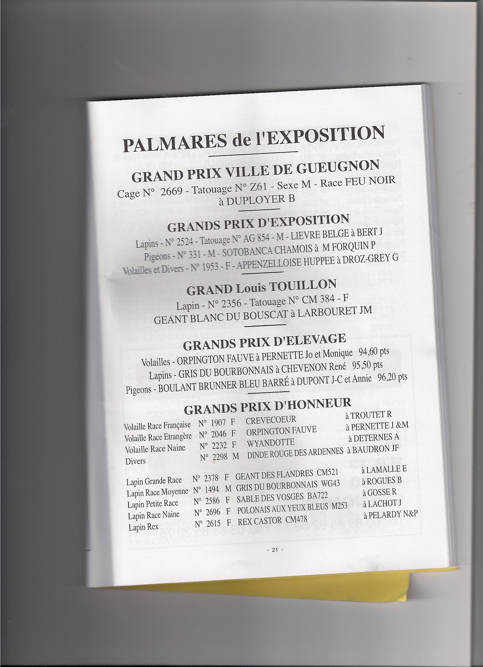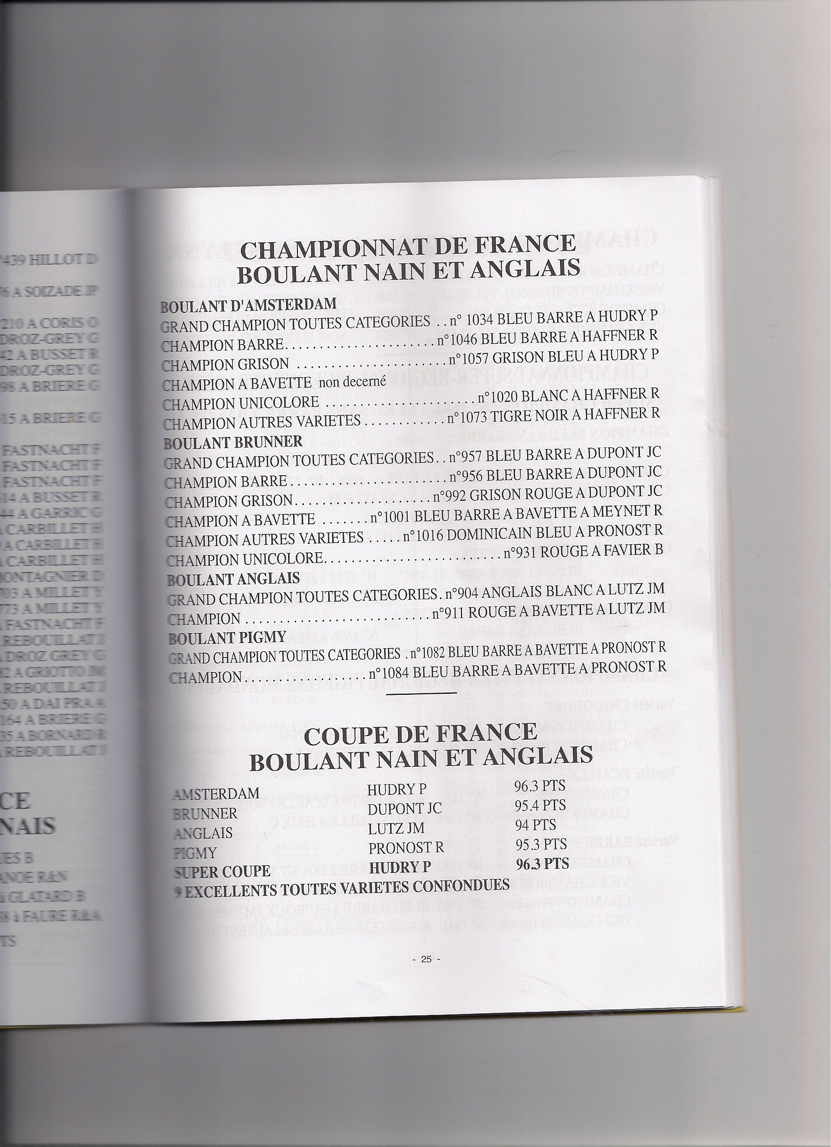 | Voilà les résultats Champion de France MJ Grison Bleu Andalou 97pts à Loubet M Champion de France sexe opposé FA Rouge 97pts à Delanoue JC Vice-Champion de France FA Blanc 97pts à Loubet G Vice-Champion de France sexe opposé MJ Papilloté Rouge Cendré Spread 97pt à Loubet M Champions en couleur Variété rare : MJ Bleu sans barre 96pts à Guillemain JL Lavande : MA 96pts à Burgy G Argenté : MA argenté écaillé 96pts à Guillemain JL Bleu : MA Bleu barré 96pts à Gaillard C Grison : MJ grison rouge cendré barré 97pts à Malgras MO Rouge cendré : MJ Rouge Cendré Spread 96pts à Kogut R Jaune : MA 97pts à Michels C Papilloté Bronze / Jaune : FJ Papilloté Bronze 96pts à Guillemain JL Papilloté Rouge Cendré Spread : MJ 97pt à Loubet M Papilloté Rouge : MJ 97pts à Lemey JL Indigo / Andalou : MJ Grison Bleu Andalou 97pts à Loubet M Qualmond : MJ Qualmond Rouge Cendré barré 97pts à Michels C Rouge : MJ 97pts à Havard A Arlequin : MJ 96pts à Michels C Jaune Cendré : FA Jaune Cendré écaillé Tpattern 96pts à Lemey JL Noir : MA 96pts à Delanoue JC Blanc : MJ 96pts à Delanoue JC Brun / Kaki : FJ Brun barré 96pts à Michels C Bronze / Sulphure : FJ Sulphure 96pts à Guiennet JC