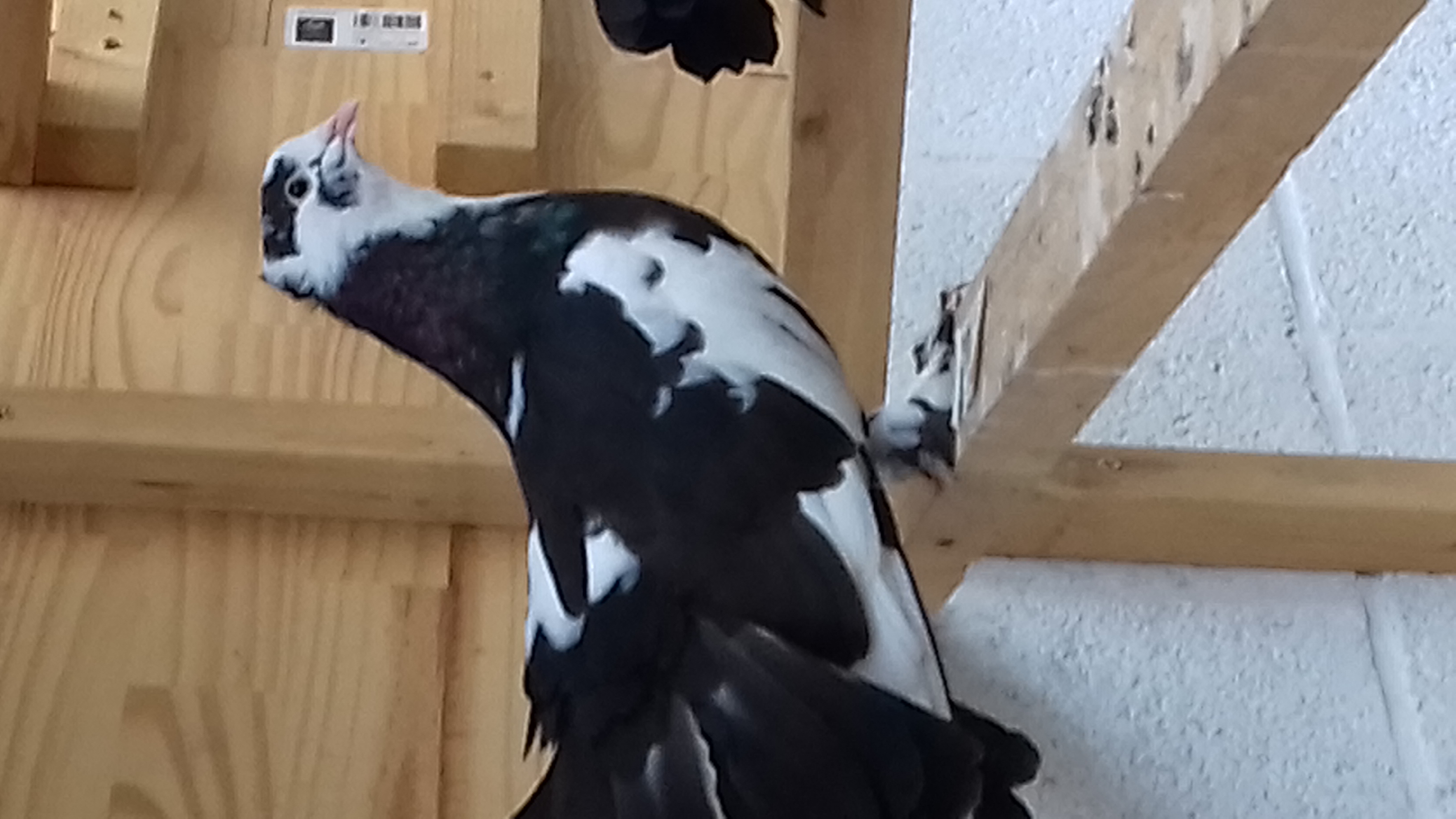 | Bien qu'il n'existe "officiellement" aucun procédé FIABLE pour déterminer à la simple vue (encore moins d'après une photo normalement ) le sexe d'un pigeon je m'aventurerai à PRONOSTIQUER, à INTUITER ton panaché noir et blanc comme étant une femelle (forme de la tête et expression de l'oeil ) . Mais je répète c'est SGDN (Sans Garantie Du Nono ) ....! Par contre , là je ne parle pas du type qui est encore trop incertain et difficilement jugeable sur photo , mais de la (très bonne ) répartition des 2 couleurs(dommage qu'on voit pas mieux la queue , à savoir s'il y a aussi une bonne proportion de blanc dans les caudales ) qui se trouvent être mes préférées , c'est un sujet très intéressant . Je t'en "débarrasse ".... quand tu veux ....! Plus haut si on se fie à l'intensité de la couleur rendue par la photo , c'est un joli lavande (en couleur) que tu as aussi !