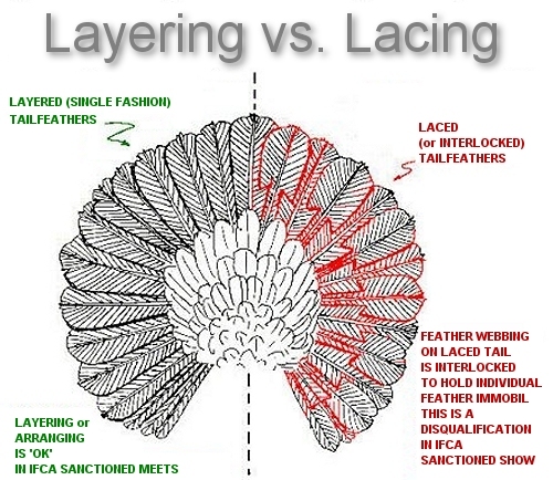 | A droite méthode du "laçage" des plumes de queue , autorisé(et même préconisé chez le Queue de Paon (fantail) et interdit chez toutes les autres races (y compris Queue de Paon Indien). A gauche le "placement " (plaçage) des plumes de queue , seul "autorisé " chez le QPI . Pour un laçage complet chez le fantail il faut bien entendu reproduire la méthode de droite à gauche de la queue A noter qu'avant de lacer la queue d'un fantail il vaut mieux bien entendu d'abord la placer. Tout de même intéressant pour ceux qui prétendraient qu'accrocher entre elles le bas (ou pire le haut mais ça tient encore moins dans le temps) des plumes serait autorisé et donc seulement du placé......