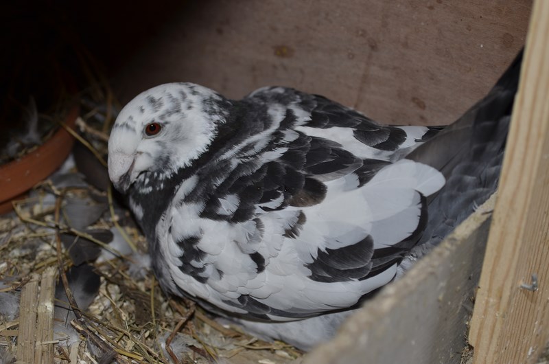 | Voici mes pigeons de beauté allemand, je n'en ai rien fait pour le moment (pas de jeune obtenu, le seul couple formé a mis longtemps à pondre et s'est fait manger ou casser ses oeufs 3 fois de suite.... ils étaient bien fécondés hélas)). Je ne veux pas tous les garder car pas assez de place et seulement 2 femelles pour 5 mâles ! 1er mâle (panaché bleu écaillé :