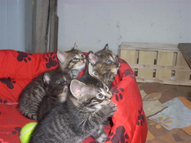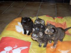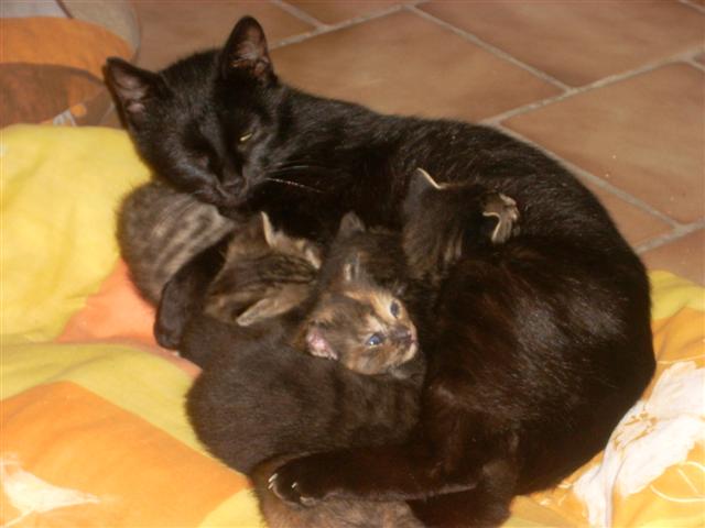 | salut a vous tous voici une chatte sauvage qui avait mis bas dans un champ.ils n'avais que quelques heures quand ma soeur les a trouvés sous une pluie battante elle les a pris avec quelques griffures a la main la chatte la suivie et les as nourris et élevé dans mon garage.et j'ai réussi a tous les casés qu'elle chance!Elle a du faire passer le mot car auj.une autre chatte est venue faire ses 2 petits a la maison pas de chance!