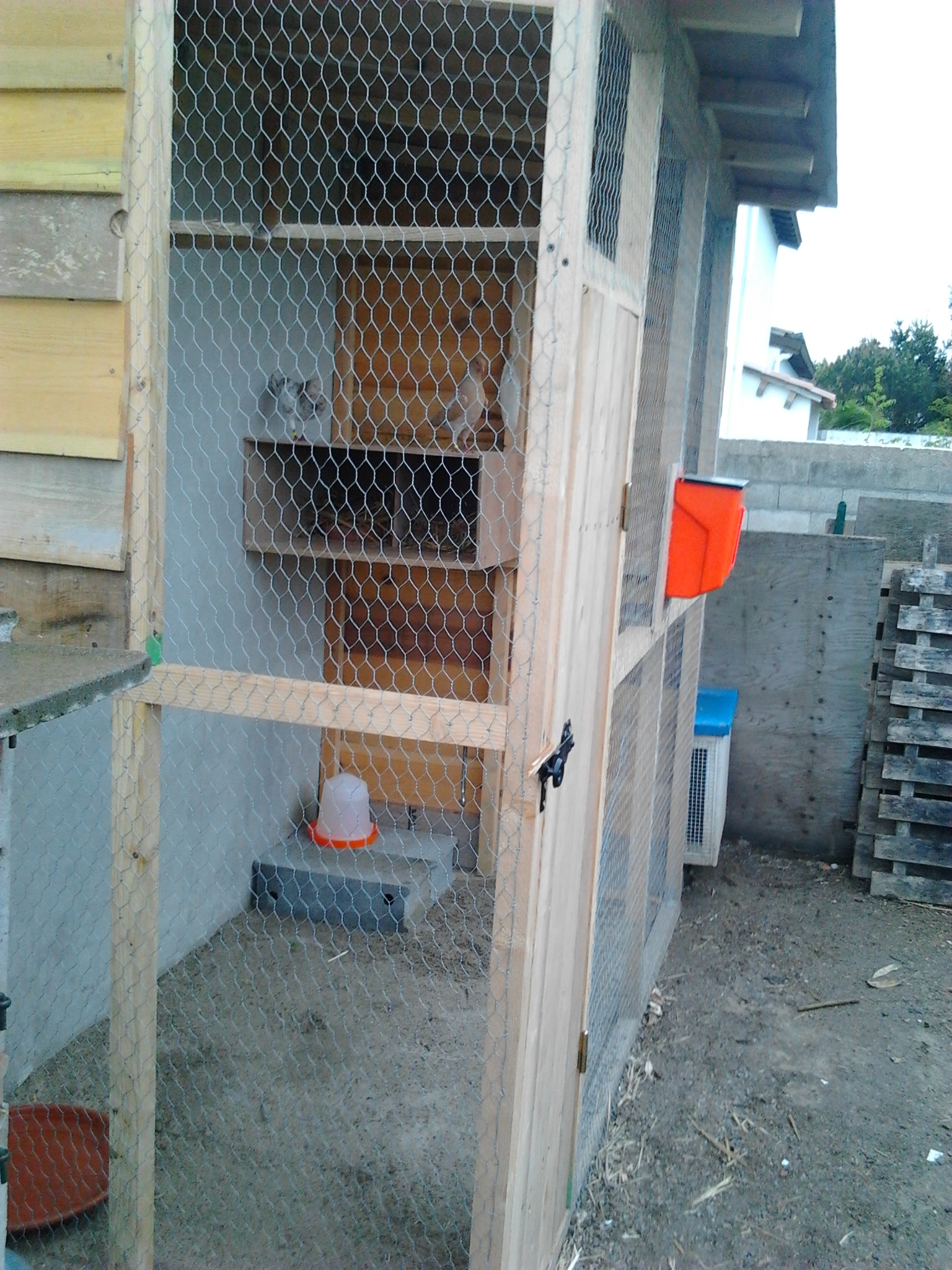| très jolie ta volière mais c'est sur trois ou quatre couples au max et il te faut une autre volière pour les jeunes puisque tu veux les garder pour les exposer Je pense aussi que tu devrais mettre ta mangeoire plus prés du sol ça doit pas être compliqué a faire si tu as déjà construit cette belle volière Les mailles du grillage me semble un peu large pour te protéger des rongeurs